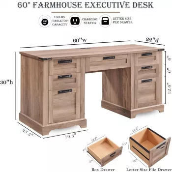 60" Farmhouse Executive Desk with Drawers, Wood Office Desk with Charging Station